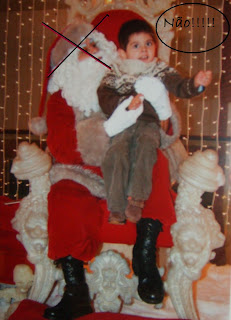 Não só não se quer sentar no colo desta figura para a tradicional fotografia (o que por mim até não é mal pensado, principalmente se não conhecer quem está "mascarado"!... sei lá quem é que ele já teve ao colo e com o quê... paranóias de mãe-galinha-preocupada com a saúde frágil do seu filhinho querido-doente crónico-fazendo um esforço para que ele tenha o máximo de experiências possível, que são tão poucas, ainda assim), como nem sequer quer tirar a tal foto da praxe apenas sentado ao lado desta mítica figura rechonchuda...